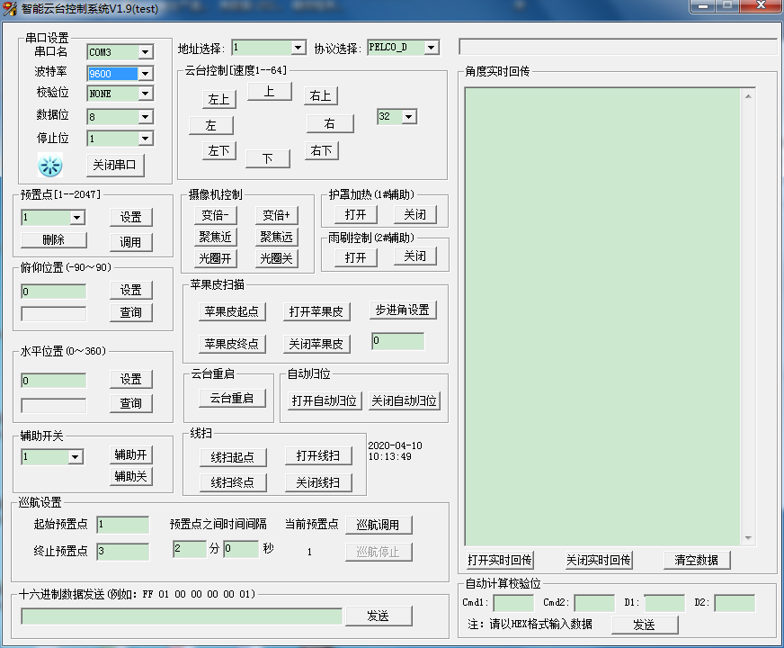 当云台接收到自动线扫描指令时云台按照顺时针水平旋转,速度与巡航速度关联,垂直则停留在当前操作的位置不变化。